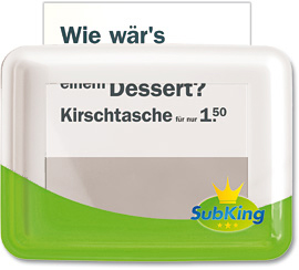 Für die Selbstbedienungsgastronomie wurden Werbe-/Promotiontabletts und -tischsets entwickelt, patentiert und produziert. Über die Vermarktung des Produkts erfahren Sie HIER mehr.